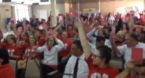 Reunidos em Curitiba os trabalhadores decidiram pela greve: ” Greve a partir de agora. Não podemos nos aquietar diante da violência do governo. Organizem a escala de 30%. Vamos nos dividir nas caravanas para Curitiba. Só a nossa união pode nos levar a algum lugar!