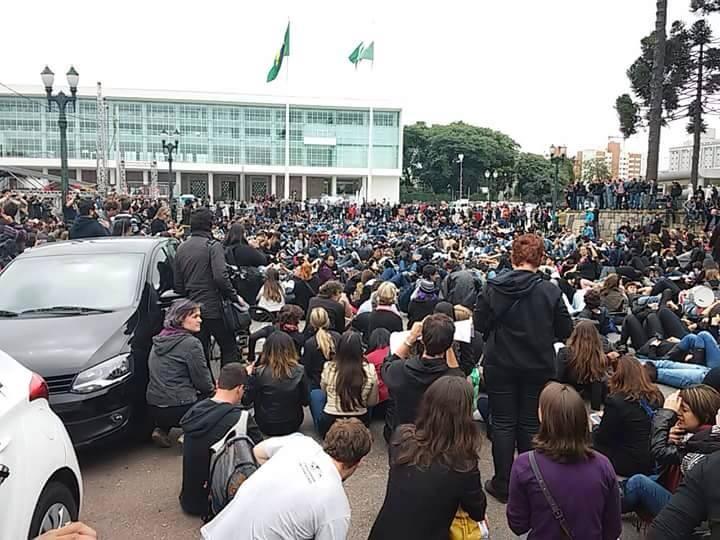 Aos gritos de “vergonha”, estudantes ocuparam a frente do Palácio Iguaçu. Palavras de ordem que pediam a renúncia do governador também foram entoadas: “Ei Polícia vai prender o Beto Richa” e “Ei soldado você está do lado errado”.