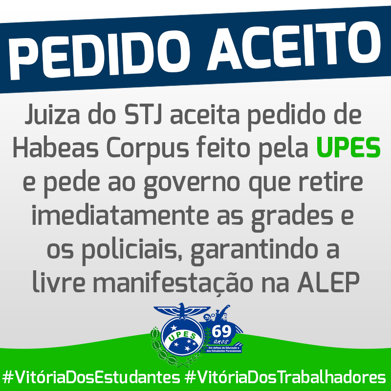 A União Paranaense dos Estudantes Secundaristas, entidade que representa os estudantes do ensino fundamental e médio do Paraná em apoio a luta dos servidores, conseguiu na manhã desta terça-feira, 28, Habeas Corpus concedido pelo STJ decretando que o governo retire imediatamente as grades e os policiais e que garante o livre direito a manifestação na Assembleia Legislativa do Paraná.