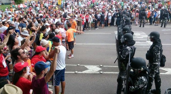 Bombas, balas de borracha e cachorros foram usados. Os professores tentam sensibilizar os policiais: “Se liga Beto Richa, o professor é amigo da polícia” gritaram.